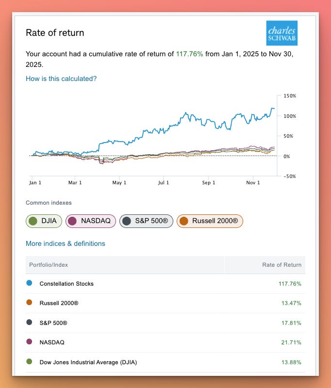 Constellation Stocks portfolio outperformed S&P 500 by 7.36%, cumulative YTD return reached +117.76% vs S&P 17.81%