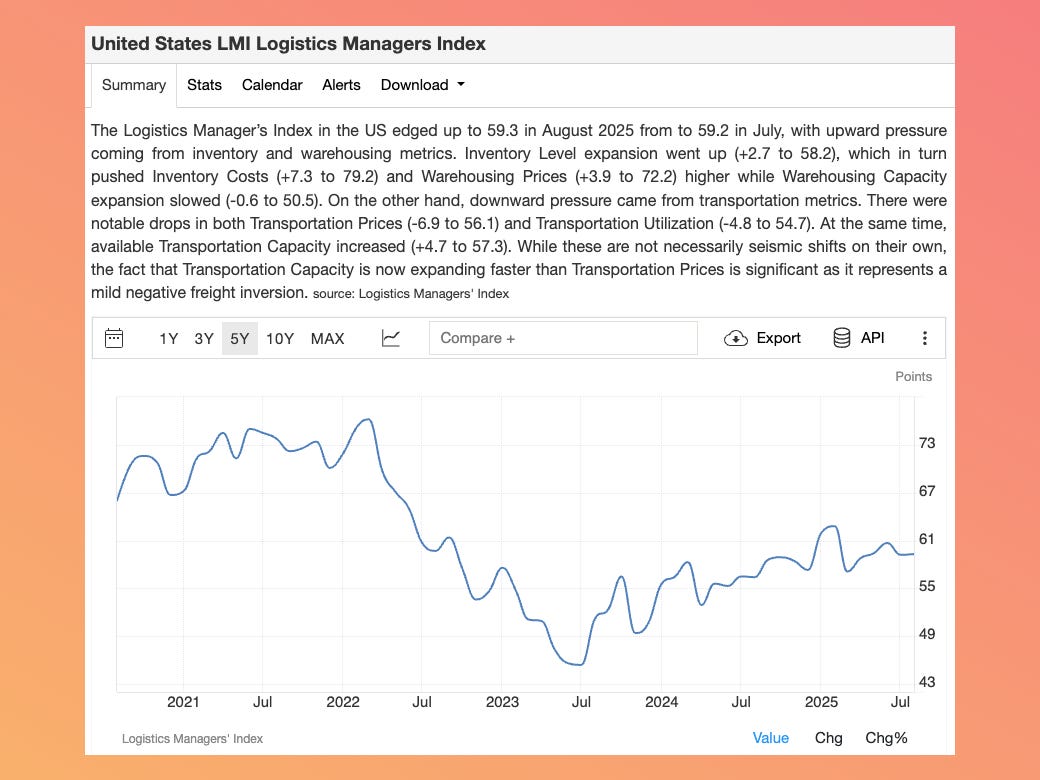 This data pairs well with the Logistics Manager’s Index released the same day. Companies built up solid inventories in August and weren’t in a hurry to replenish them.