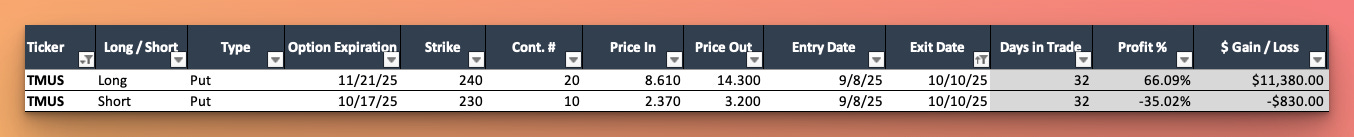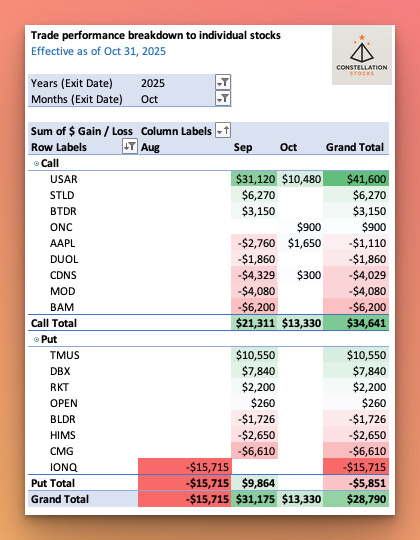 Here is the October realized P/L breakdown by the specific trades executed: