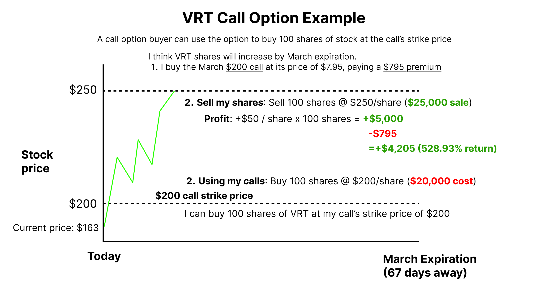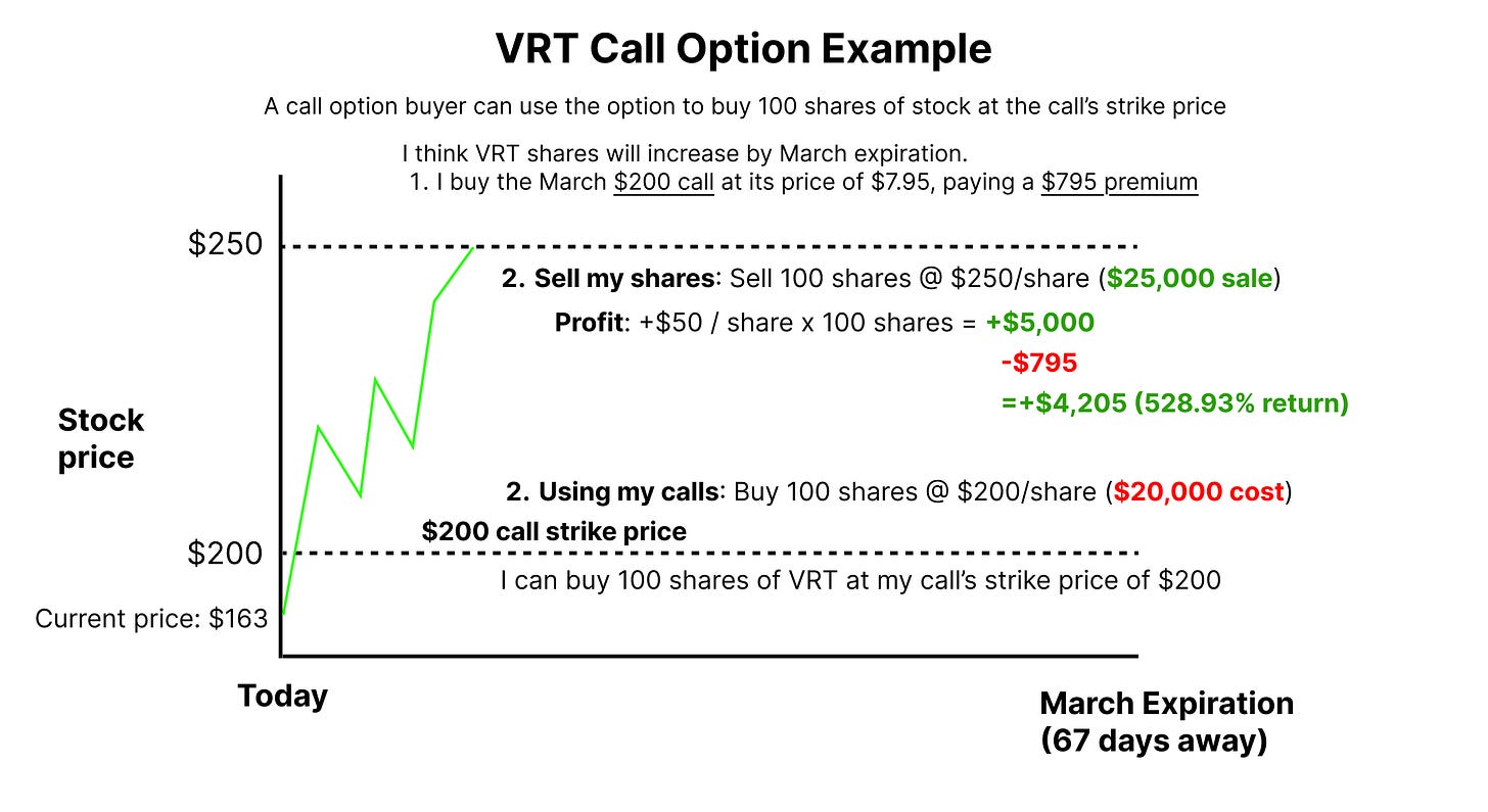 If you own a $200 call, you have the right to buy 100 shares at $200, even if the stock is trading far above that price later. Imagine the stock trading at $250 and that you can buy it at $200. That’s a $50 profit per share.