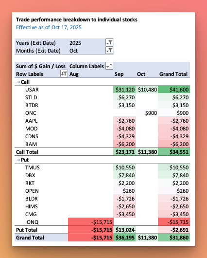 I booked $41,600 profits for my $USAR trade, which was a Dec/Nov calendar spread - the in-the-money leg with strike $21 brought me $31,120, and a short leg with strike $30 brought another $10,480. This trade proved to be one of the most successful of the year, both in terms of structuring techniques and P&L results. I executed this trade back in September and was residually increasing exposure up to .4x of a normal position size, and to maximize the return, I sold the short leg with a strike $40 in October, which wasn’t optimal, as if I hadn’t done that, the long leg wasn’t capped and would have brought more money. But risk management is a priority, especially for trades bringing 500% on premium paid like this.