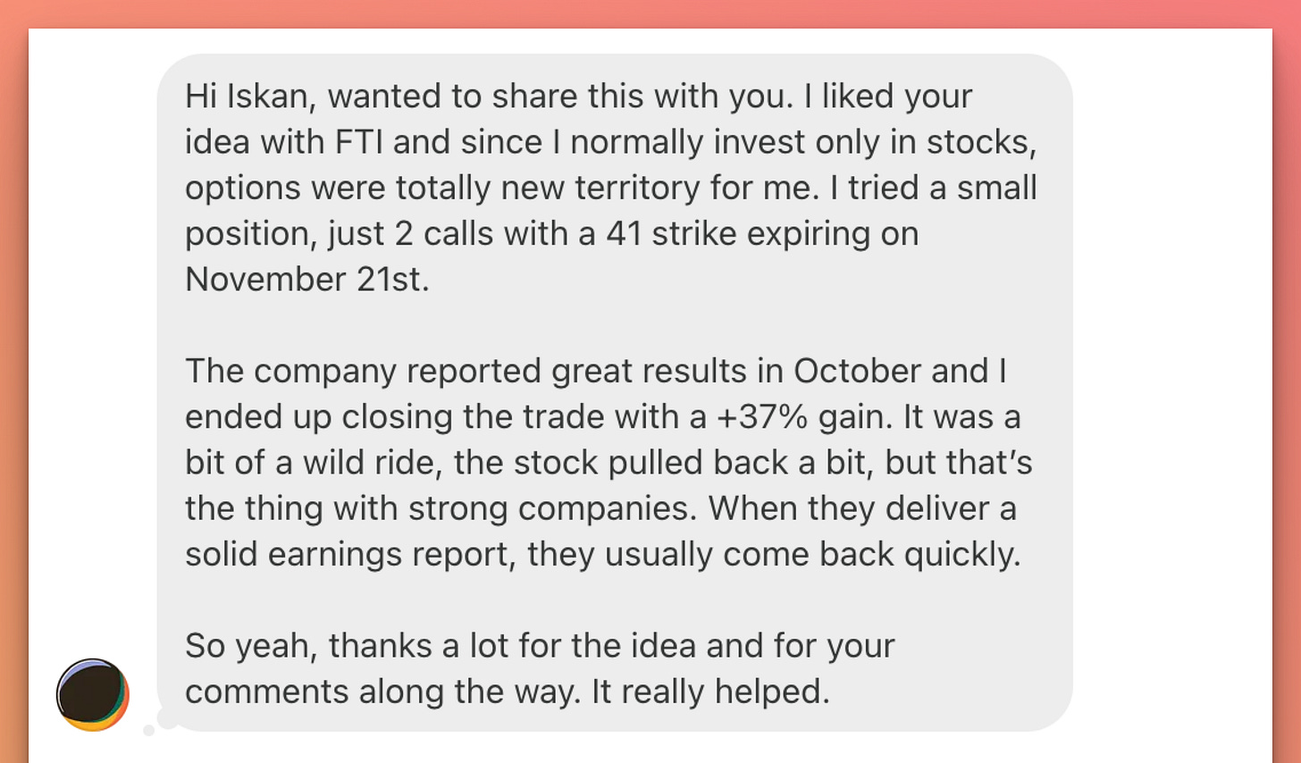 Here’s another student testimonial who got a 37% gain by implementing my frameworks. He achieved this result just a couple of weeks after becoming a founding subscriber. He’s a financial auditor with experience investing in stocks.